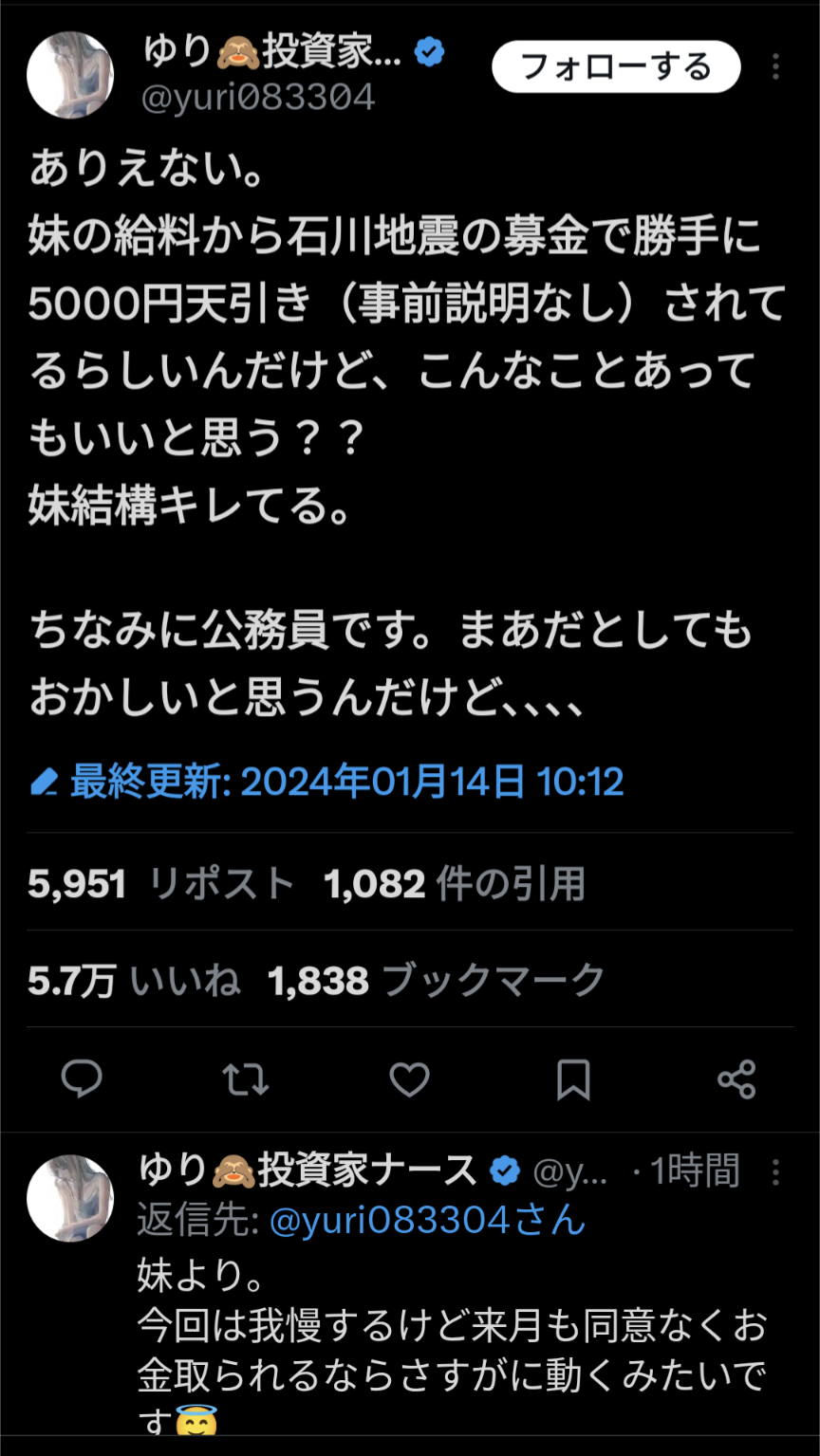 【悲報】公務員さん、無断で給料から能登地震の募金5000円が天引きされたと訴える 新種タイプのデマか