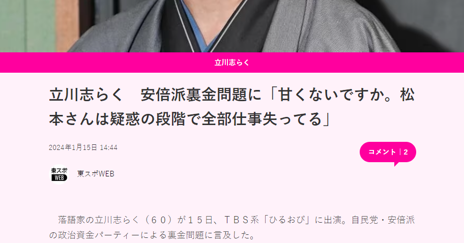 【裏金問題】立川志らく 安倍派裏金問題に「甘くないですか。松本さんは疑惑の段階で全部仕事失ってる」