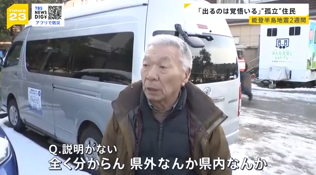 「(Q.どちらへ二次避難される)分からない。県の人の考えは分からん。(Q.説明がない)全くわからん。県外なんか県内なんか。『県のバスに乗ったら行き先を話します』ってわけわからん。どこか全く分からん、県外かも」