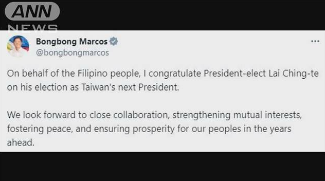 マルコス大統領は15日、自身のSNSで台湾総統選挙で当選した頼氏に対し「緊密な協力を期待している」と祝意を表明しました。