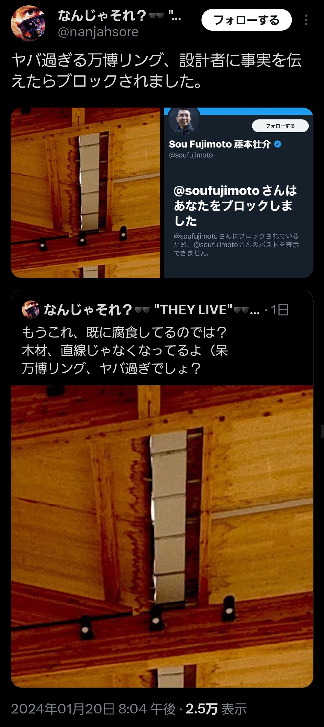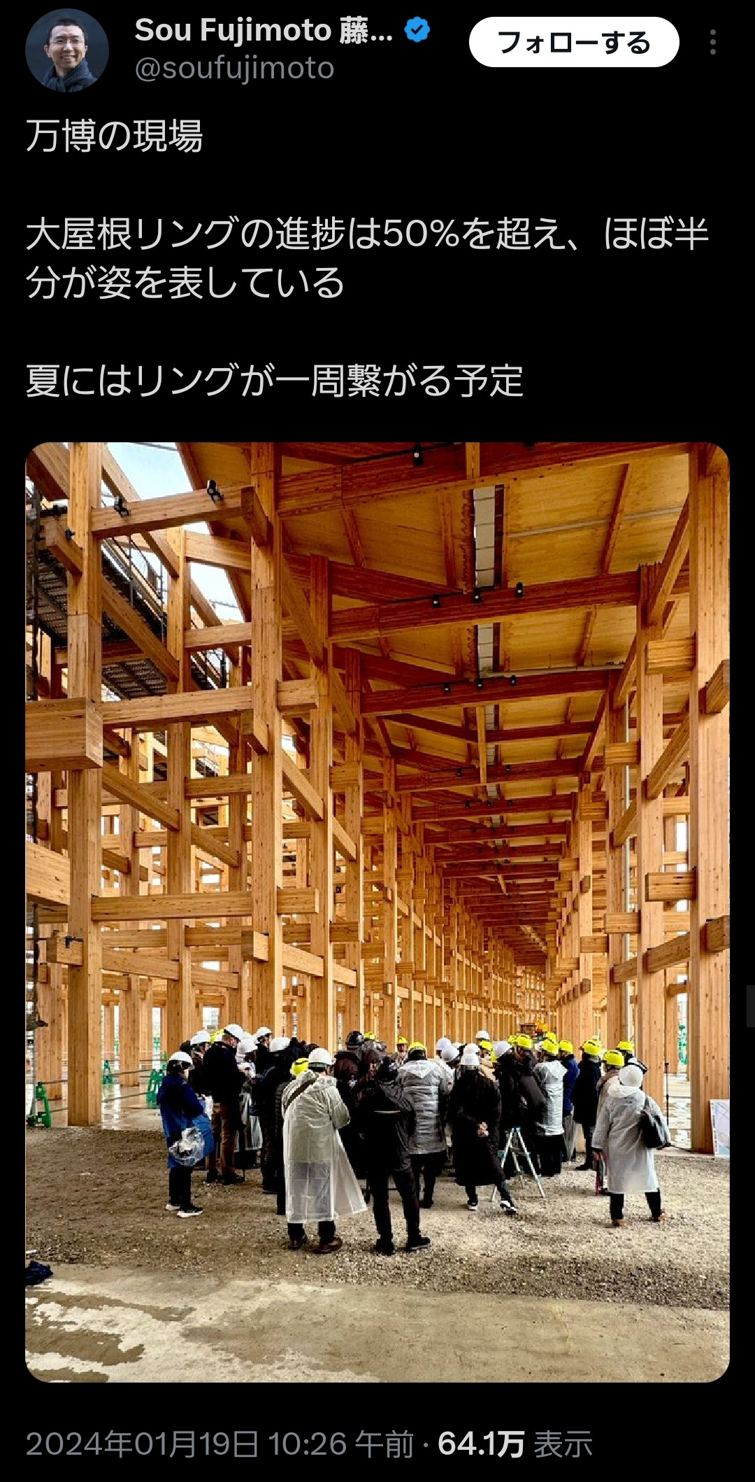 【画像】大阪万博リング設計者「進歩状況50%に達しました」SNS「画像これ雨で腐り始めてる」→