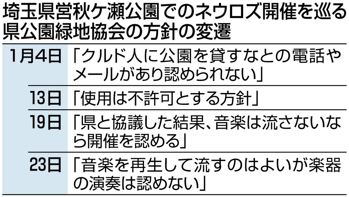 浅田朋範 山田暢史 2024年1月24日 7時00分埼玉県営の「秋ケ瀬公園」(さいたま市)でクルド人たちが春に開催している祭り「ネウロズ」について、県公園緑地協会が一時、クルド人が公園を使うことに反対する人たちが妨害に来る可能性を考え、運営に協力する団体に「今年は許可できない」と伝えていたことがわかった。協会はその後、方針を撤回。23日に、当初の判断は誤りだったとして団体側に謝罪した。