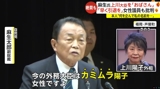 麻生副総裁から「おばさん」「美しい方とは言わん」、上川陽子外相本人の反応wwww
