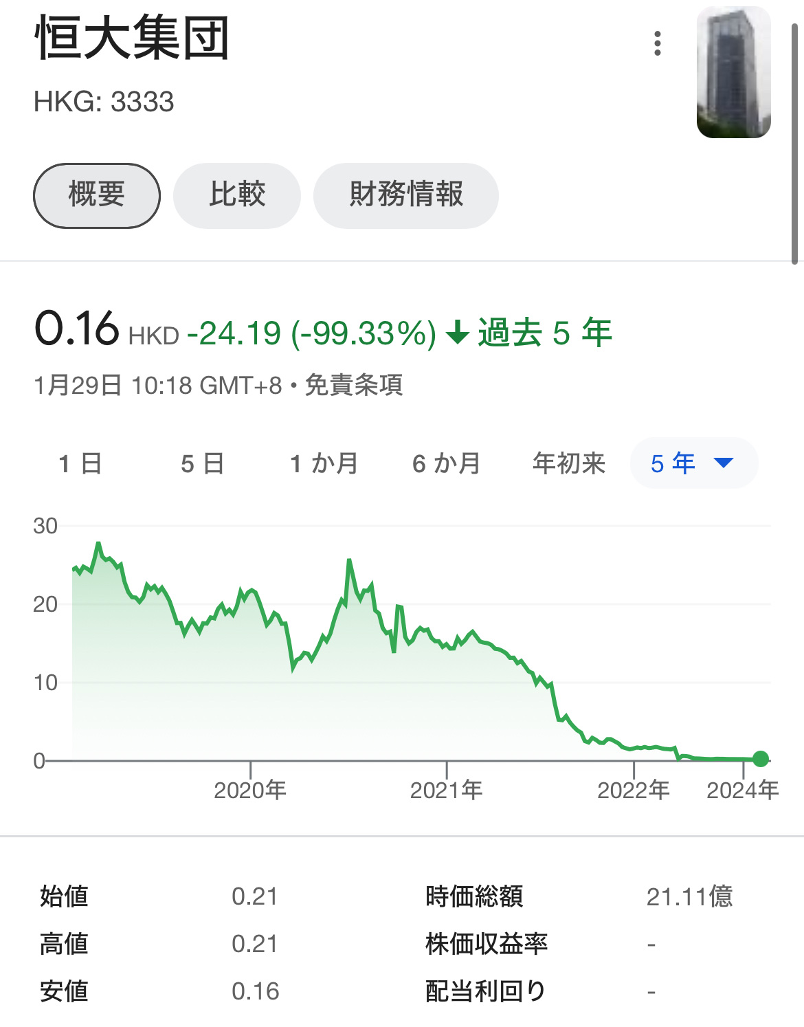 【速報】清算命令を出された中国恒大集団、株価がちょっとヤバいwwwwwww