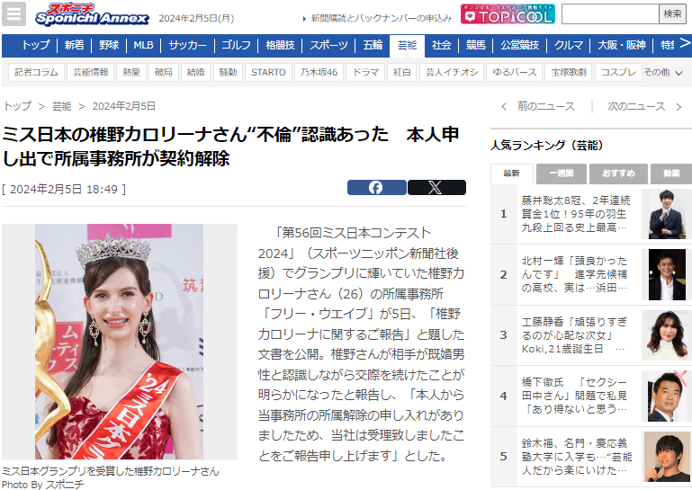 「第56回ミス日本コンテスト2024」(スポーツニッポン新聞社後援)でグランプリに輝いていた椎野カロリーナさん(26)の所属事務所「フリー・ウエイブ」が5日、「椎野カロリーナに関するご報告」と題した文書を公開。