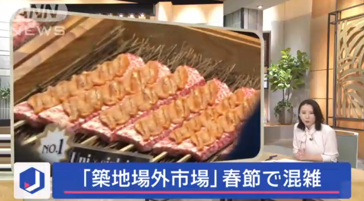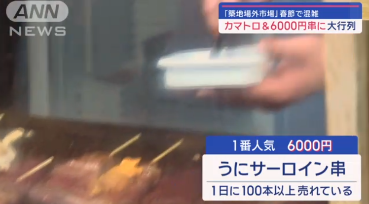 春節を迎えた中国から多くの観光客が日本各地を訪れるなか、東京・築地の場外市場が大にぎわいなんです。1本5000円を超える牛串に長蛇の列ができました。