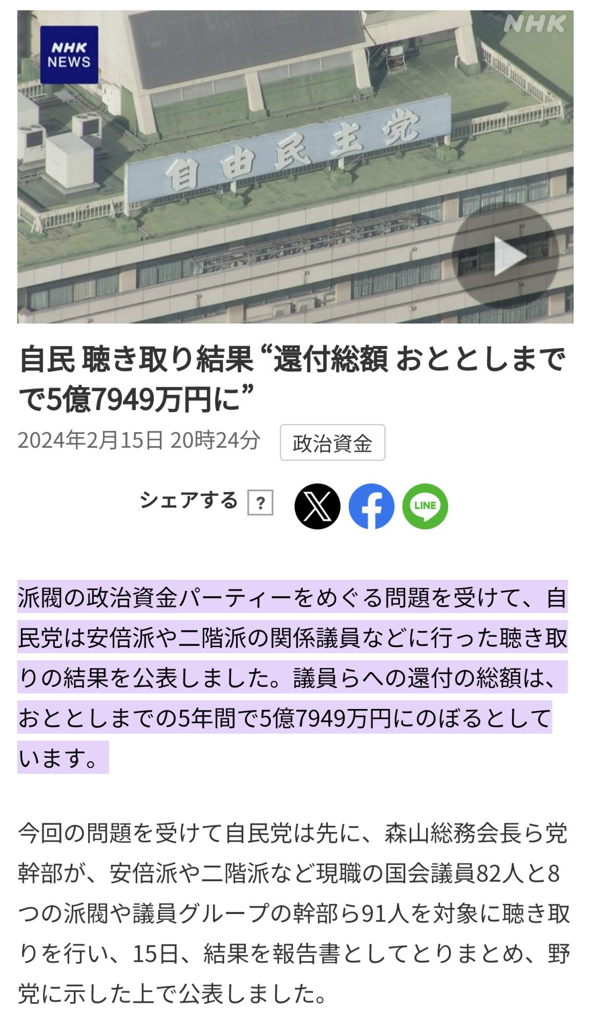 1: 名無し 2024/02/18(日) 19:25:02.88 ID:gynMPKF70 BE:455830913-2BP(2000)自民 聴き取り結果 “還付総額 おととしまでで5億7949万円に”