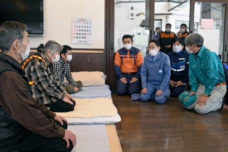 午前に訪れたのは約90人が身を寄せる穴水町の避難所。被災者が布団の上で首相を待ち受けけた。避難所では首相の到着直前になってストーブが片付けられ、トイレに行くのも制限された。70代女性は、普段と異なる「演出」に「訪問の本来の趣旨とは違う気がする」と首をかしげた。