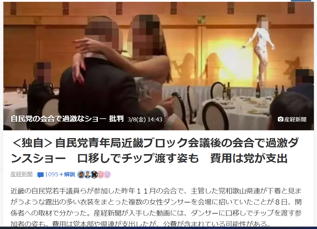 【悲報】青年局近畿ブロック、自民党のお金で会合に過激ダンサー呼びもう滅茶苦茶「口移しでチップ渡す姿も」