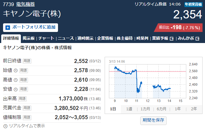 キヤノン電子<7739>が急落。宇宙スタートアップのスペースワン(東京都港区)が13日午前に打ち上げた小型ロケット「カイロス」初号機について、打ち上げ後に爆発したと報じられたことが嫌気されている。