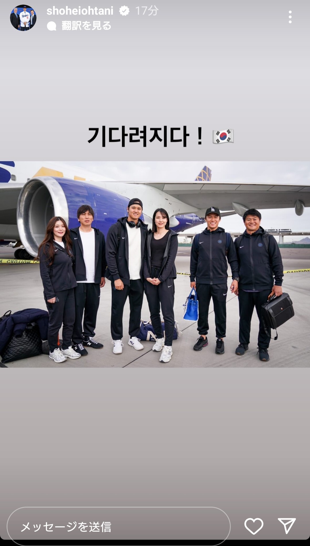 左側には通訳の水原一平夫妻、右には山本由伸と園田芳大通訳が位置する6人で写るほのぼのとしたショット。投稿には韓国語で「待ち遠しい!」記し、開幕シリーズに向けての思いを表した。