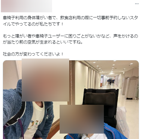 車椅子利用の身体障がい者で、飲食店利用の際に一切事前予約しないスタイルでやってるのが私たちです!