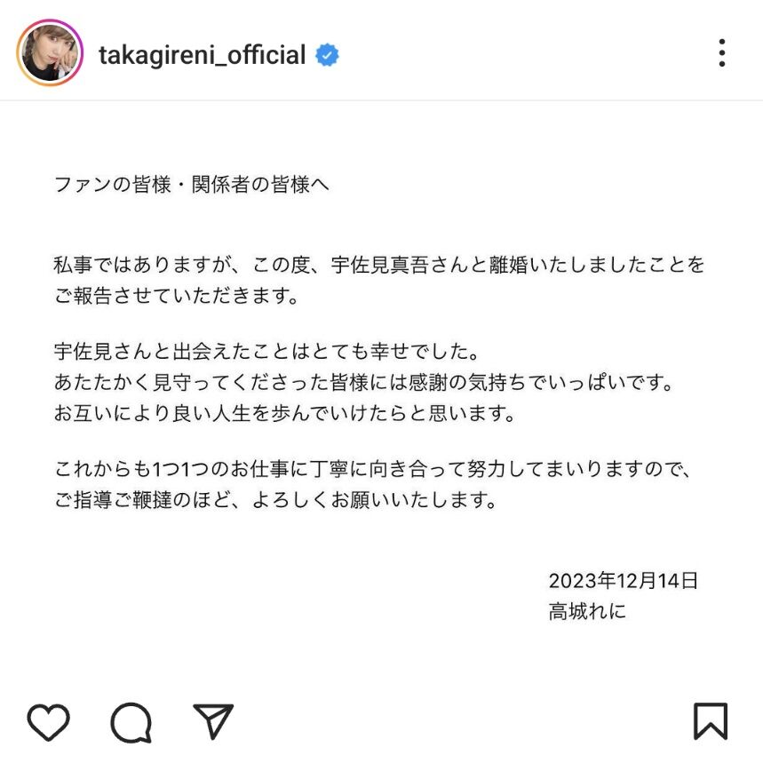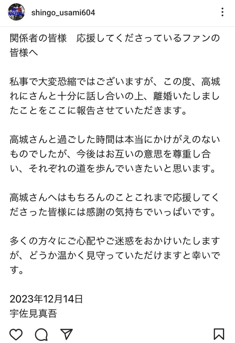 ももいろクローバーZの高城れに(30)が14日に自身のインスタグラムを更新し、中日の宇佐見真吾捕手(結婚当時日本ハム、30)と離婚したことを報告した。2人は2022年11月に結婚を公表。1年1か月の結婚生活にピリオドを打った。