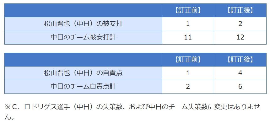 3/29(金)ヤクルト-中日1回戦(神宮)、8回裏無死、村上宗隆選手(S)の飛球で二塁まで達したプレイに対しロドリゲス遊撃手(D)の「失策」としましたが、「安打と失策」と訂正、それに伴い松山晋也投手(D)の自責点を「1」から「4」に訂正します