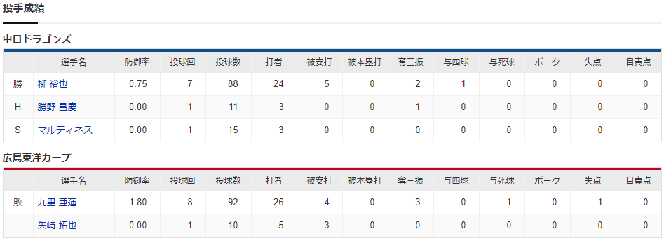 カープ九里8回自責点0!柳と互角のエース対決!田村2安打&好守も痛恨エラーで勝負決する【広島0-1中日/試合結果】