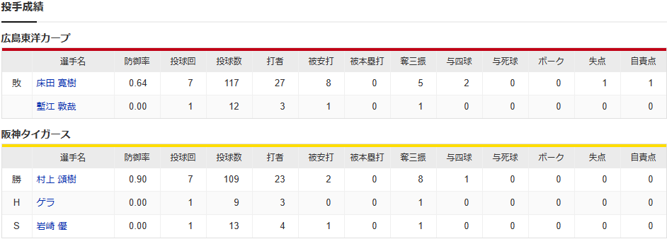 カープ4試合連続完封負け&甲子園11連敗でセリーグ&球団ワーストタイ。床田7回1失点も36回無得点で見殺し。天敵村上攻略ならず【広島0-1阪神/試合結果】
