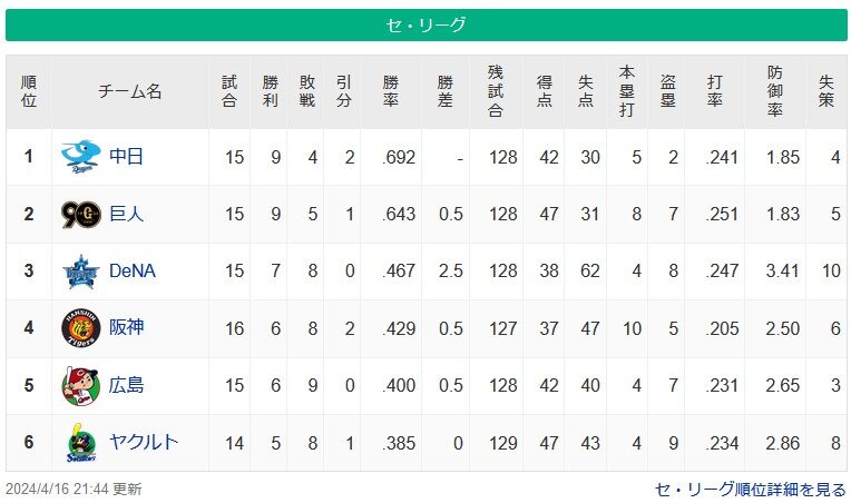 【セリーグ】竜-巨==//-星-虎-鯉燕【4/16】