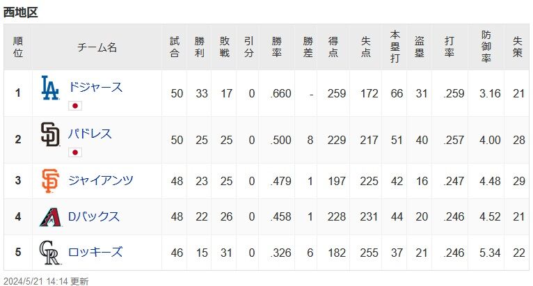 ドジャースとパドレス、まだ5月なのに8ゲーム差