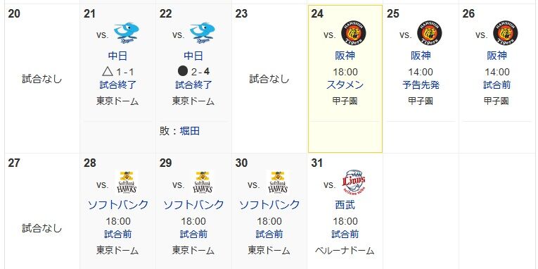 巨人(5月8勝8敗1分)の今月残り試合→神神神休ソソソ西