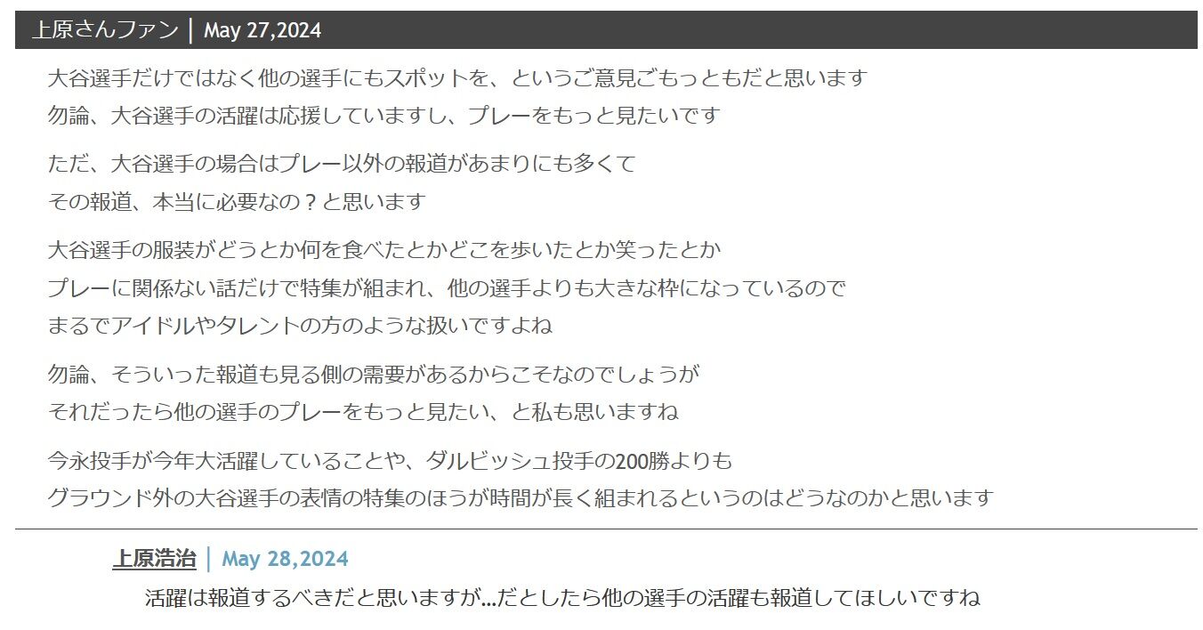 【定期】上原浩治さん、本日も加熱する大谷報道に喝「他の選手の活躍も報道を」