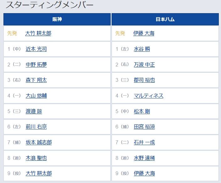 1(中)近本、2(二)中野、3(右)森下、4(一)大山、5(三)渡辺、6(左)前川、7(捕)坂本、8(遊)木浪、9(投)大竹