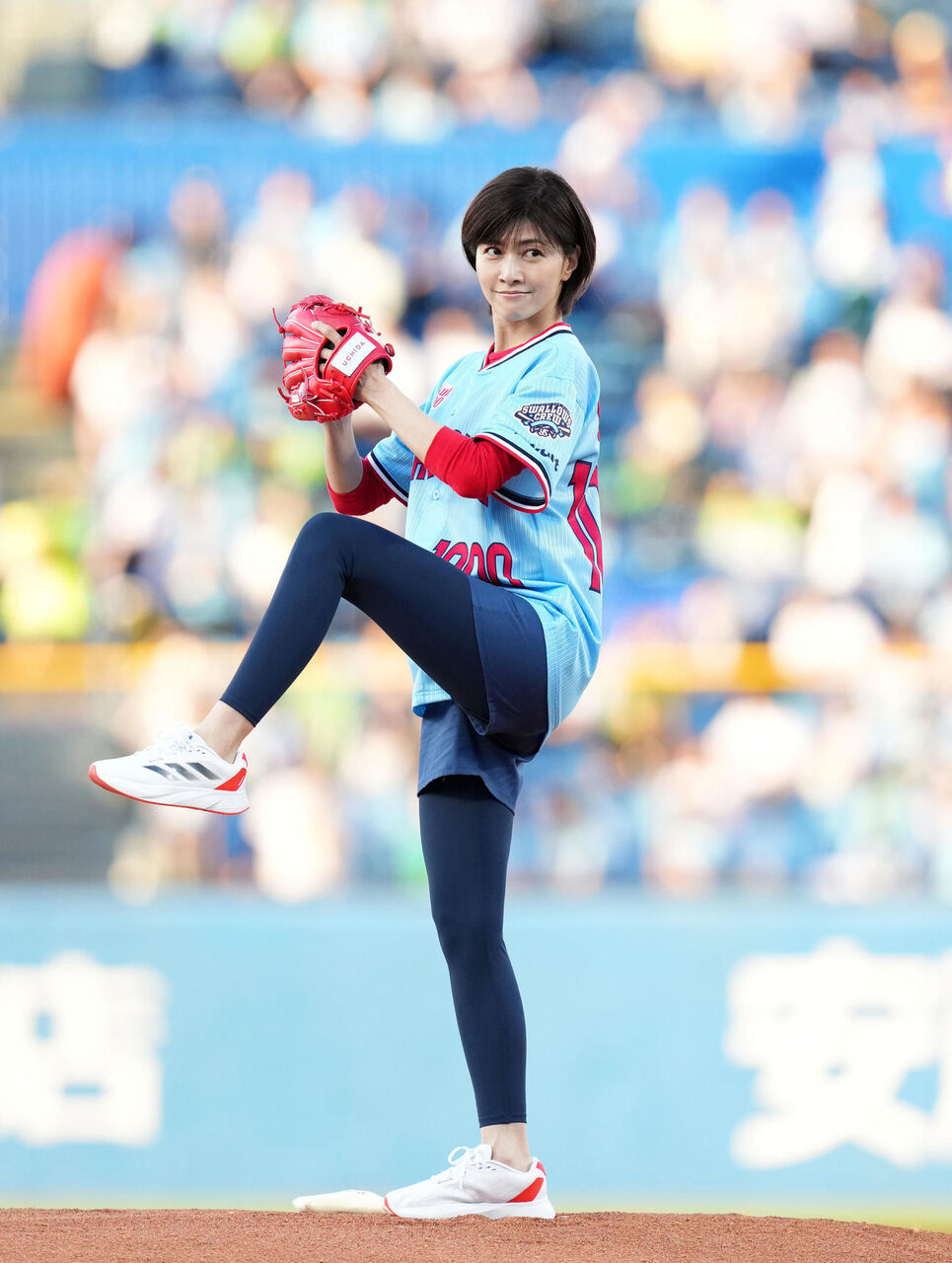 内田有紀30年ぶり始球式、2バウンド投球も「1000点です!」前回は大胆透明コスチューム