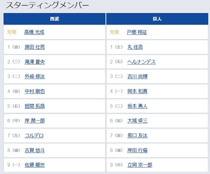 【西武対巨人1回戦】6(指) 大城 卓三 9(中) 立岡 宗一郎