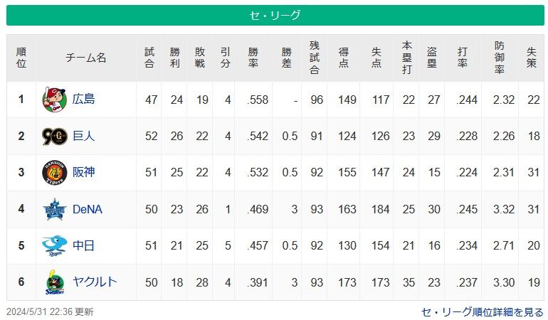●●●●●●●●●●東京●●●●中日●●●横浜 阪神○○○読売○○○○広島○○○○○