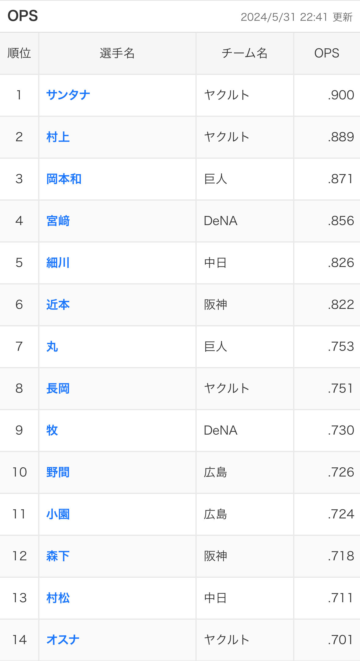 セパOPSランキング、物足りないけどしょうがないかって数値になる