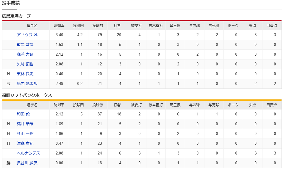 広島ソフトバンク_アドゥワ誠_和田毅_投手成績