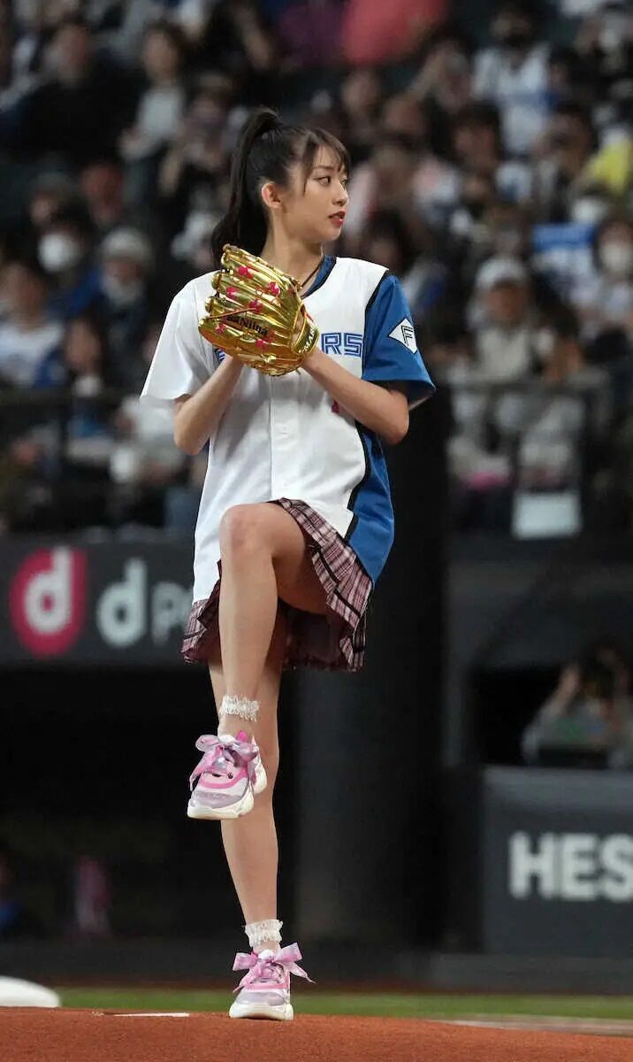 アイドルグループ「モーニング娘。’24」の牧野真莉愛(23)がファーストピッチに登場。豪快なノーバウンド投球でエスコンフィールドをどよめかせた。