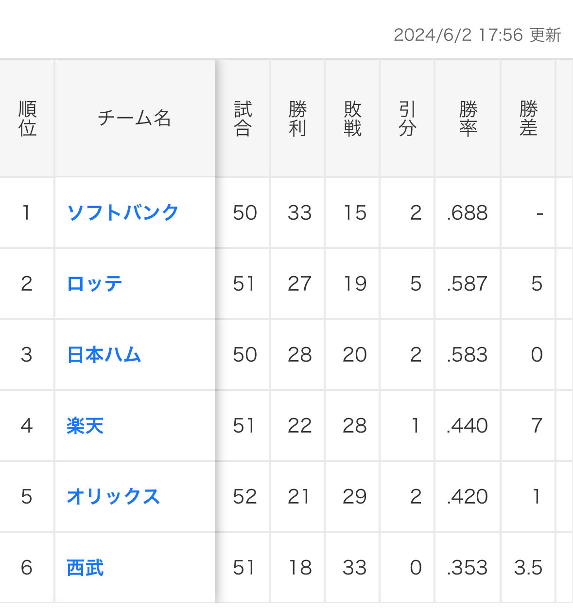 ロッテ、昨日まで15試合負けなし!さて1位とのゲーム差は……