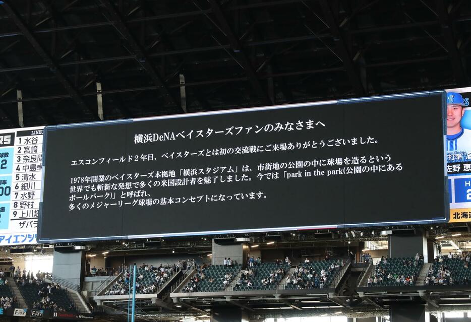エスコンフィールドでDeNA実施されるのは今回が初めて。「横浜DeNAベイスターズファンのみなさまへ」と題し、「ベイスターズとは初の交流戦にご来場ありがとうございました」とまず感謝の思いが記された。