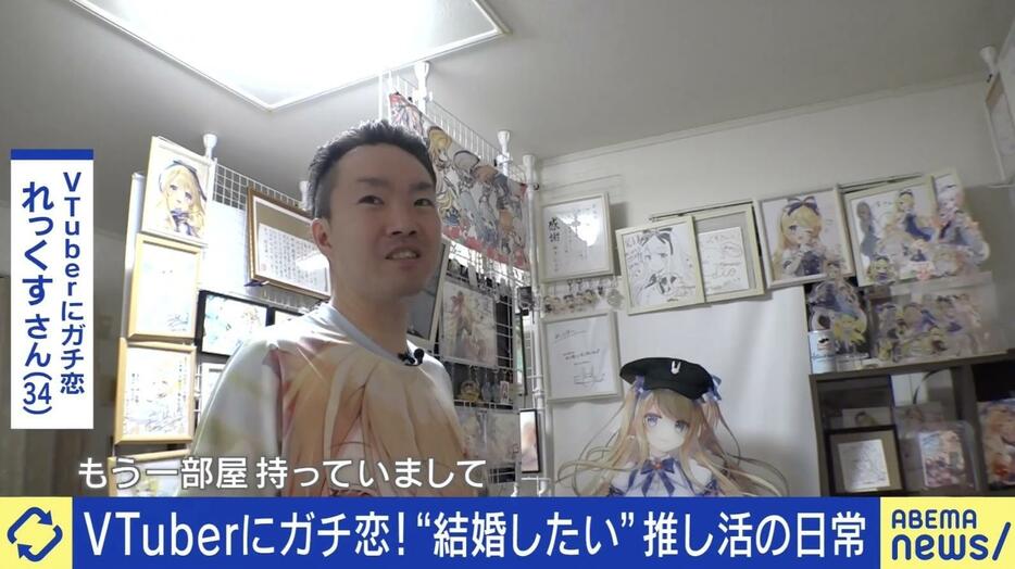 れっくすさん(34)がガチ恋しているのは、VTuberの絵夢アリスさん。1体33万円の等身大アクリルパネルをはじめ、グッズはほぼ全て購入した。「絵夢アリスさん以外と結婚するつもりはありません」と宣言し、毎晩の配信では「浮気はほどほどにしてくださいね!」などのコメントを投げかける。