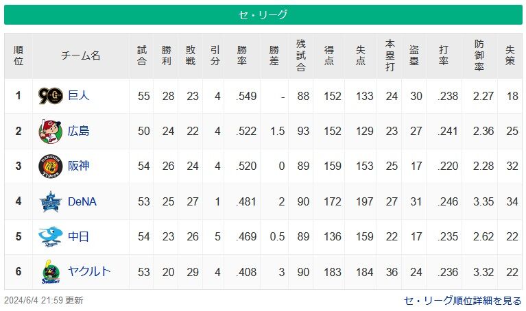 【6/4】●●●●●●●●●東京●●●中日●●横浜 阪神○○広島○○読売○○○○○