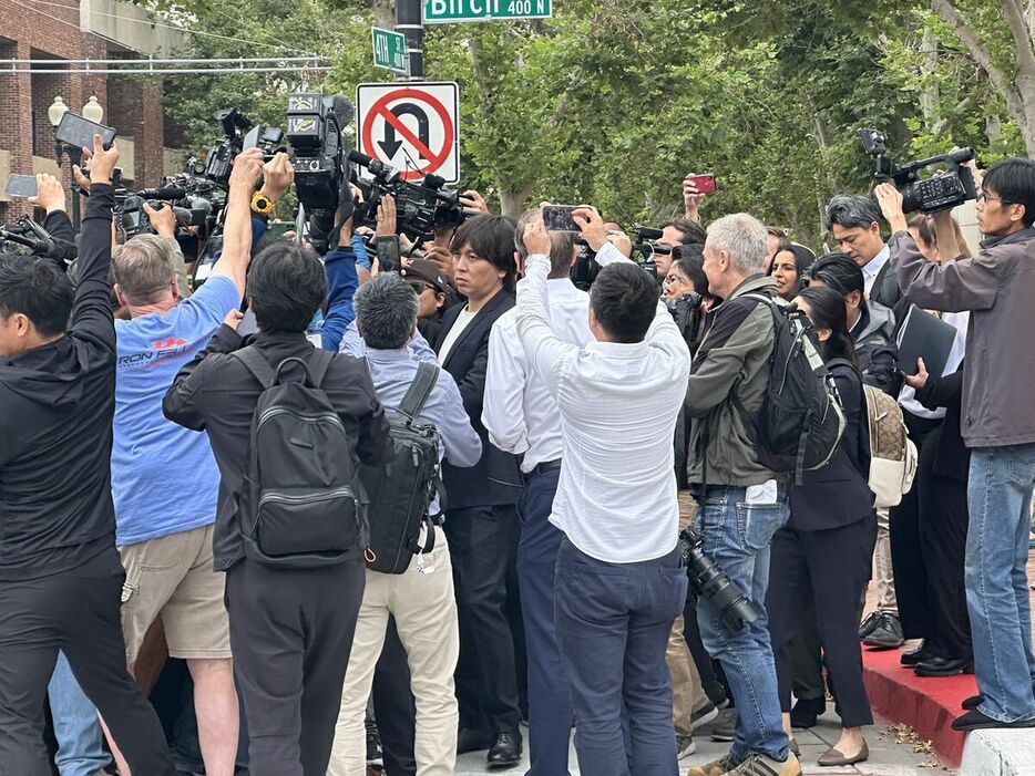 閉廷後にカリフォルニア州サンタアナの連邦地裁を出て大勢の報道陣に囲まれる水原一平被告(カメラ・村山みち通信員)