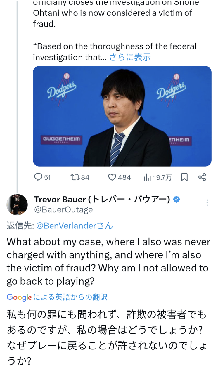 【悲報】バウアー「大谷が無罪でプレーできるならならなんで俺はプレーできないの?俺も無罪だけど」