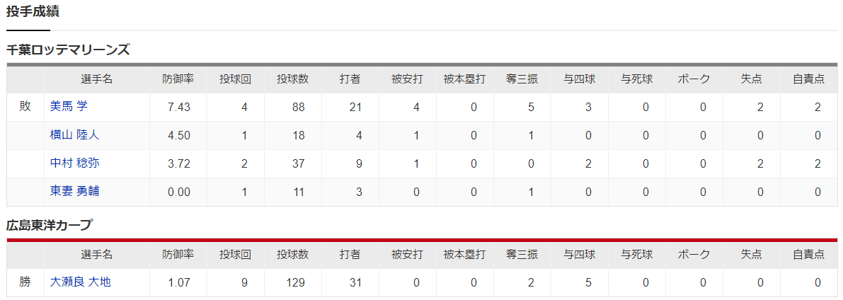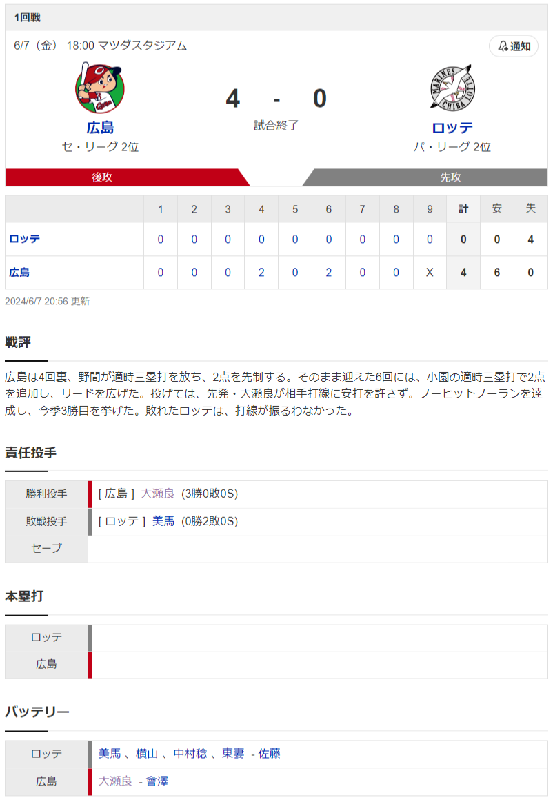 カープ大瀬良ノーヒットノーラン達成_試合結果