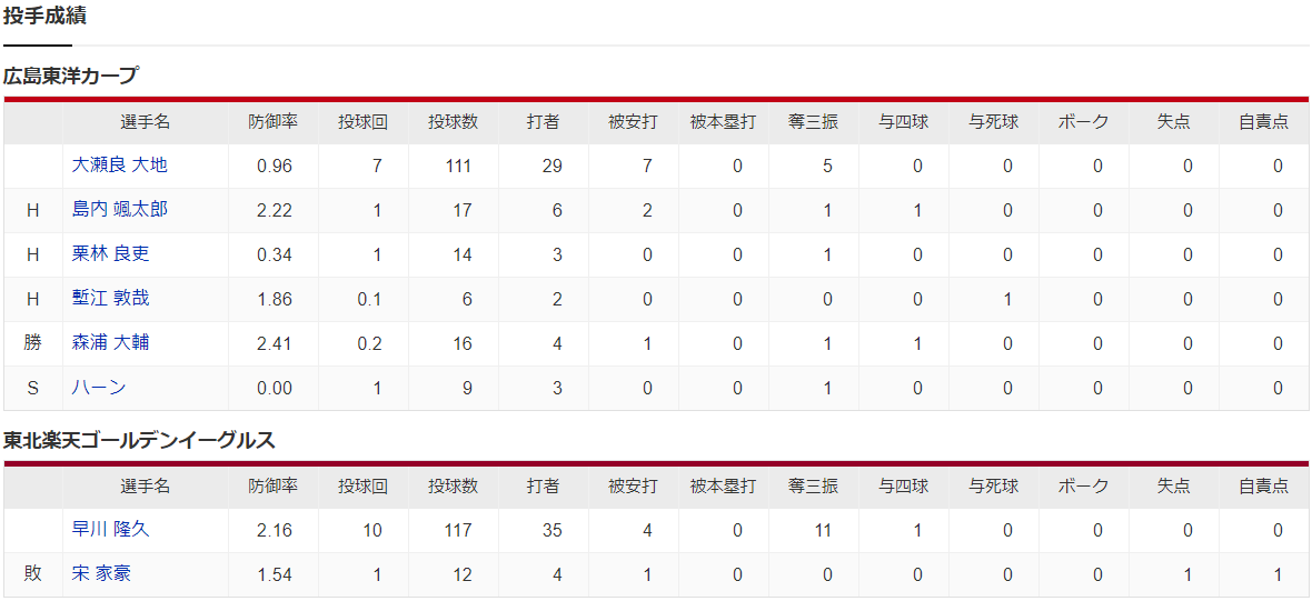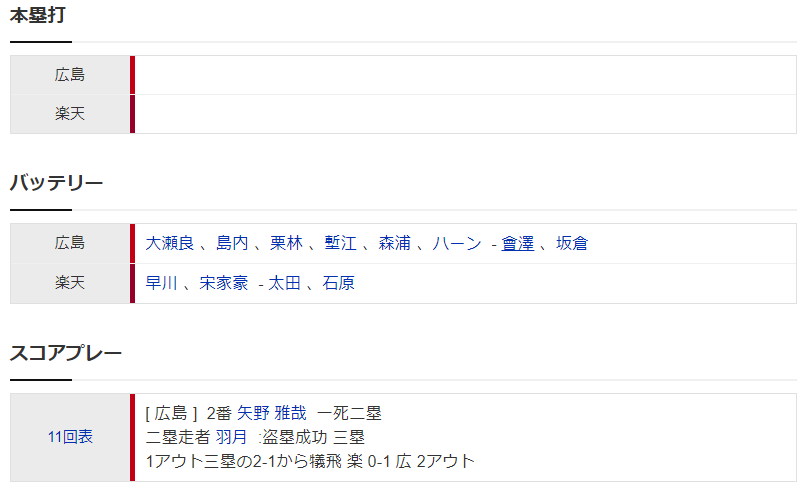 カープ羽月三盗から矢野決勝犠飛!二俣2安打!大瀬良7回0封!森浦満塁ピンチ火消し!ハーン初セーブで延長11回の超投手戦制する!【広島1-0楽天/試合結果】