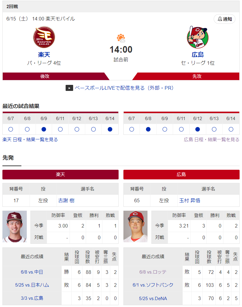 対する広島の先発は高卒5年目の玉村。交流戦の2登板は黒星こそ喫しているものの、それぞれ6回2失点、5回2失点と試合をつくっている。今日の投げ合いを制し、チームを勝利に導くのはどちらの投手か。