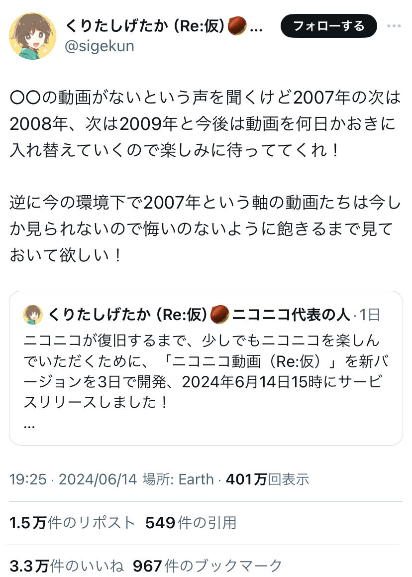 【朗報】ニコニコ動画CEO「2008年、2009年の動画もアップしていく。今のうちに2007年動画見といて」