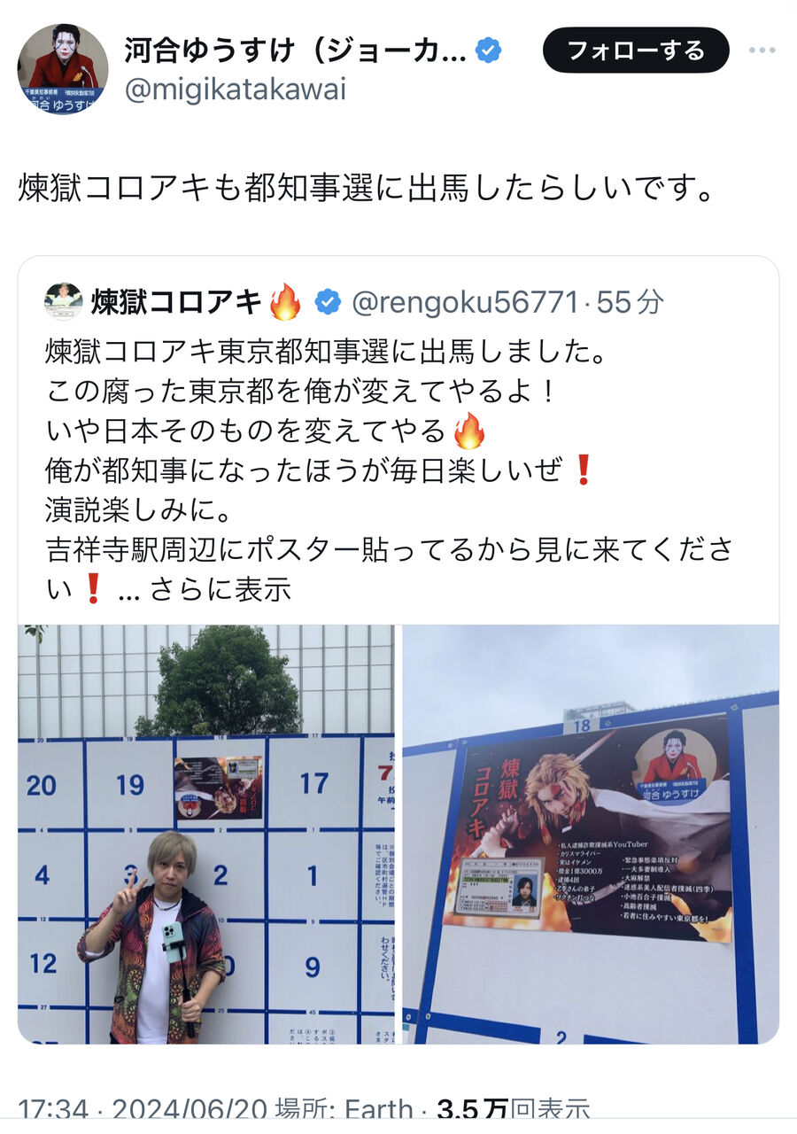 煉獄コロアキ「東京都知事選、立候補しました事をご報告します」