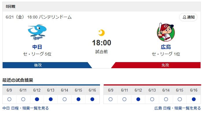 ワイ中日(最下位)ファン、今日からの広島(1位)3連戦に震える