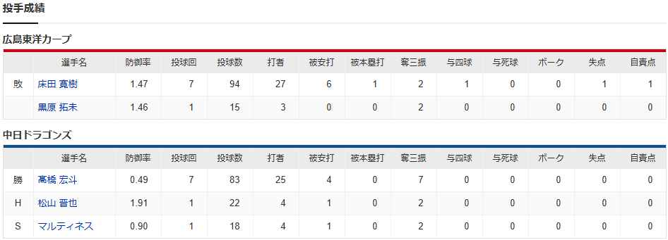 カープ床田HQSも今季12度目完封負け。小園猛打賞!野間マルチ!髙橋宏攻略ならず零封リレー許す【広島0-1中日/試合結果】