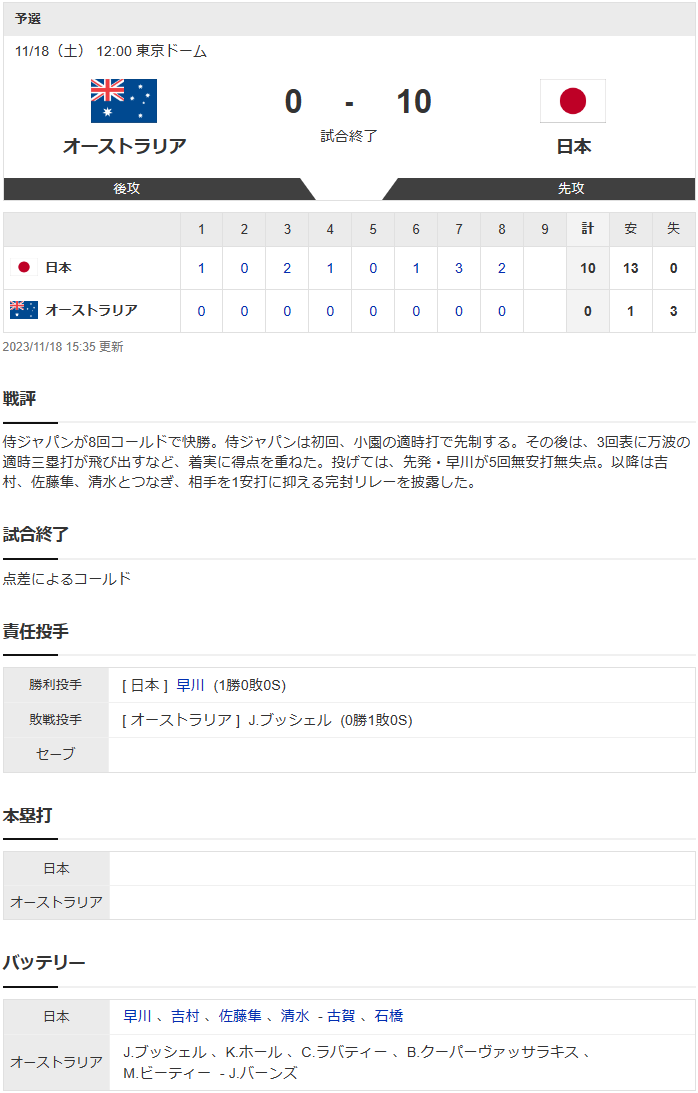 【侍ジャパン】オーストラリアに10得点でコールド勝ち 3連勝で決勝進出