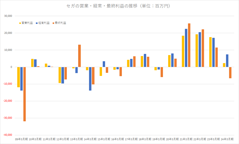 セガの2024年3月期(第66期)の決算は、売上高1866億5500万円(前の期比2.6%減)、営業利益23億4500万円(同86.7%減)、経常利益74億3800万円(同56.8%減)、最終損失66億5000万円(前の期114億8800万円の利益計上)と大幅減益・最終赤字転落だった。