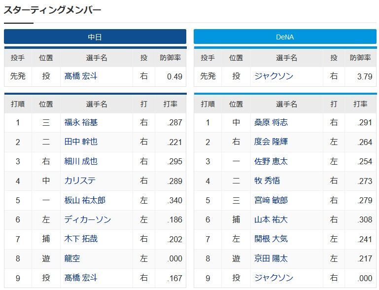 【中日ドラゴンズのスタメン】1(三)福永 3(右)細川 4(中)カリステ 5(一)板山 6(左)ディカーソン
