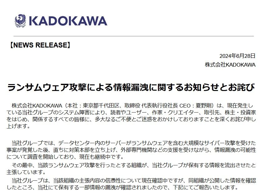 ランサムウェア攻撃による情報漏洩に関するお知らせとお詫び