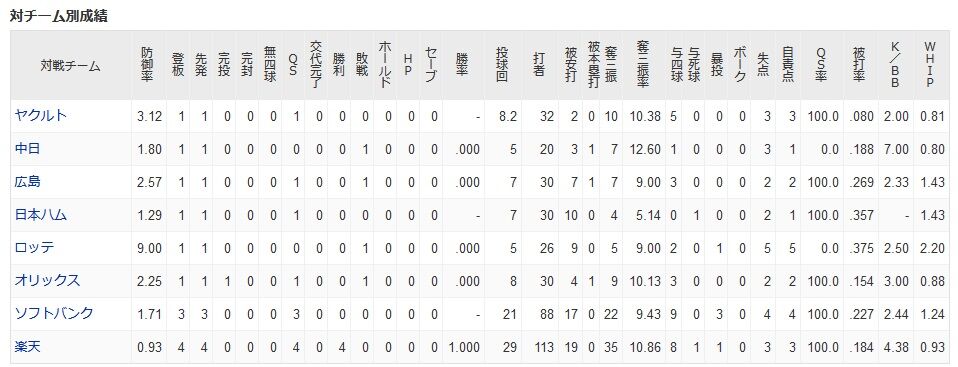 VS 楽天 4先発 4勝0敗 防御率0.93