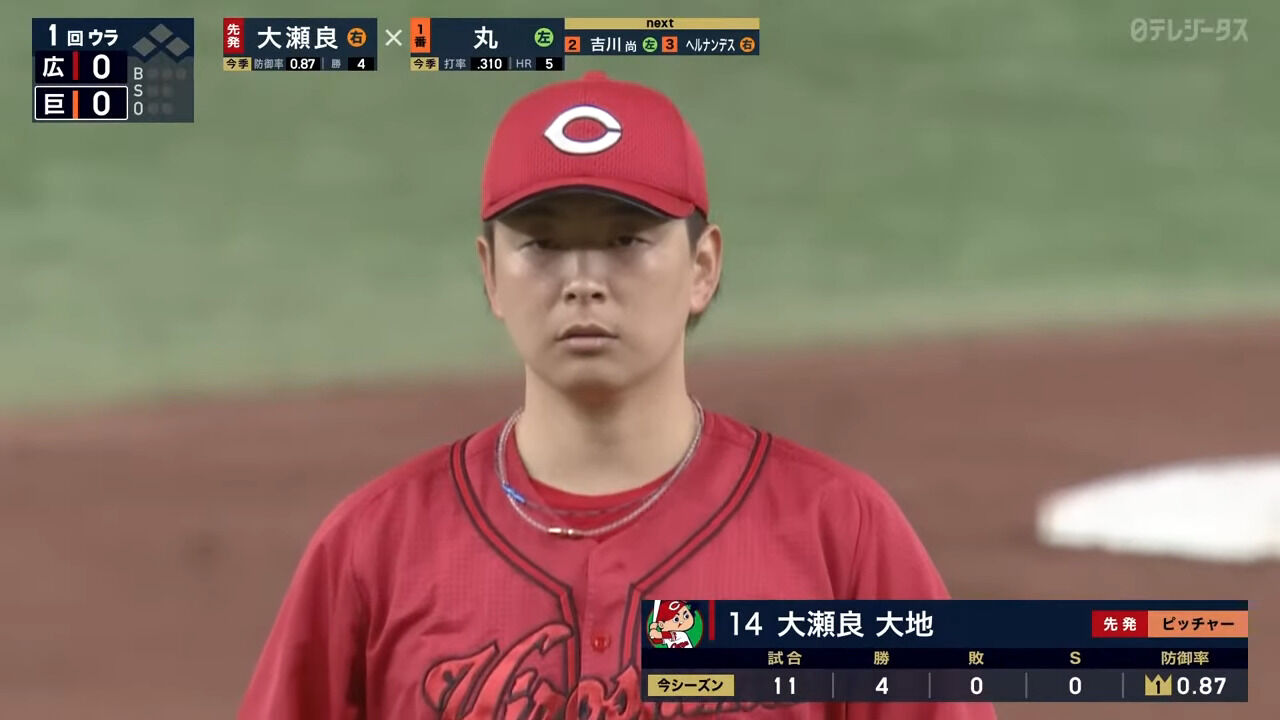 大瀬良大地(12登板)79回4勝0敗防御率0.80(1位)WHIP0.94